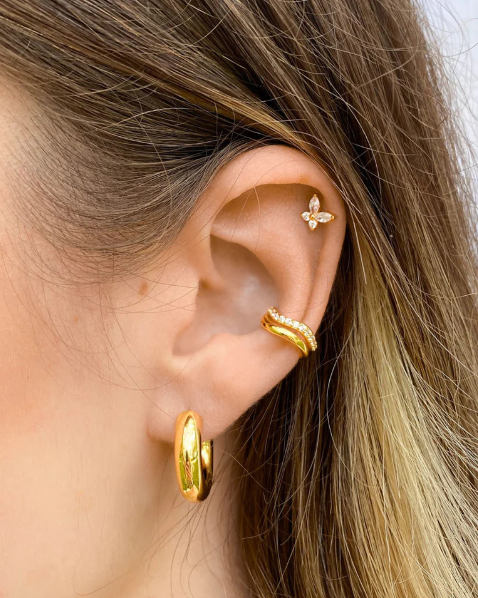 Ein Ear Cuff in Silber in geschwungener Form mit vielen kleinen weißen Zirkonia Steinen besetzt.